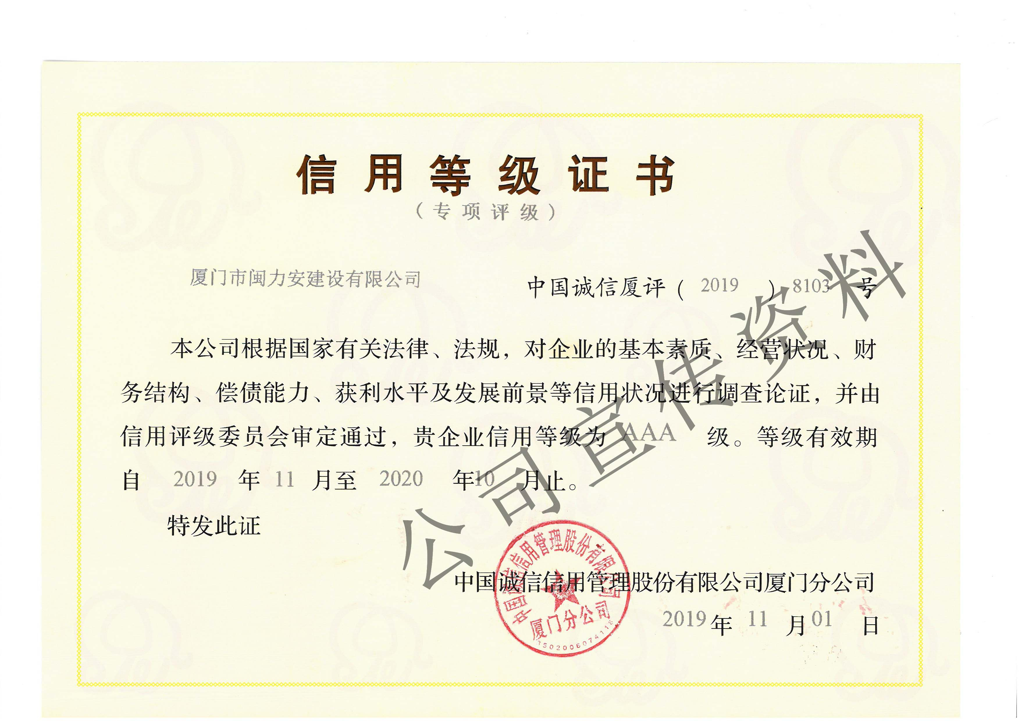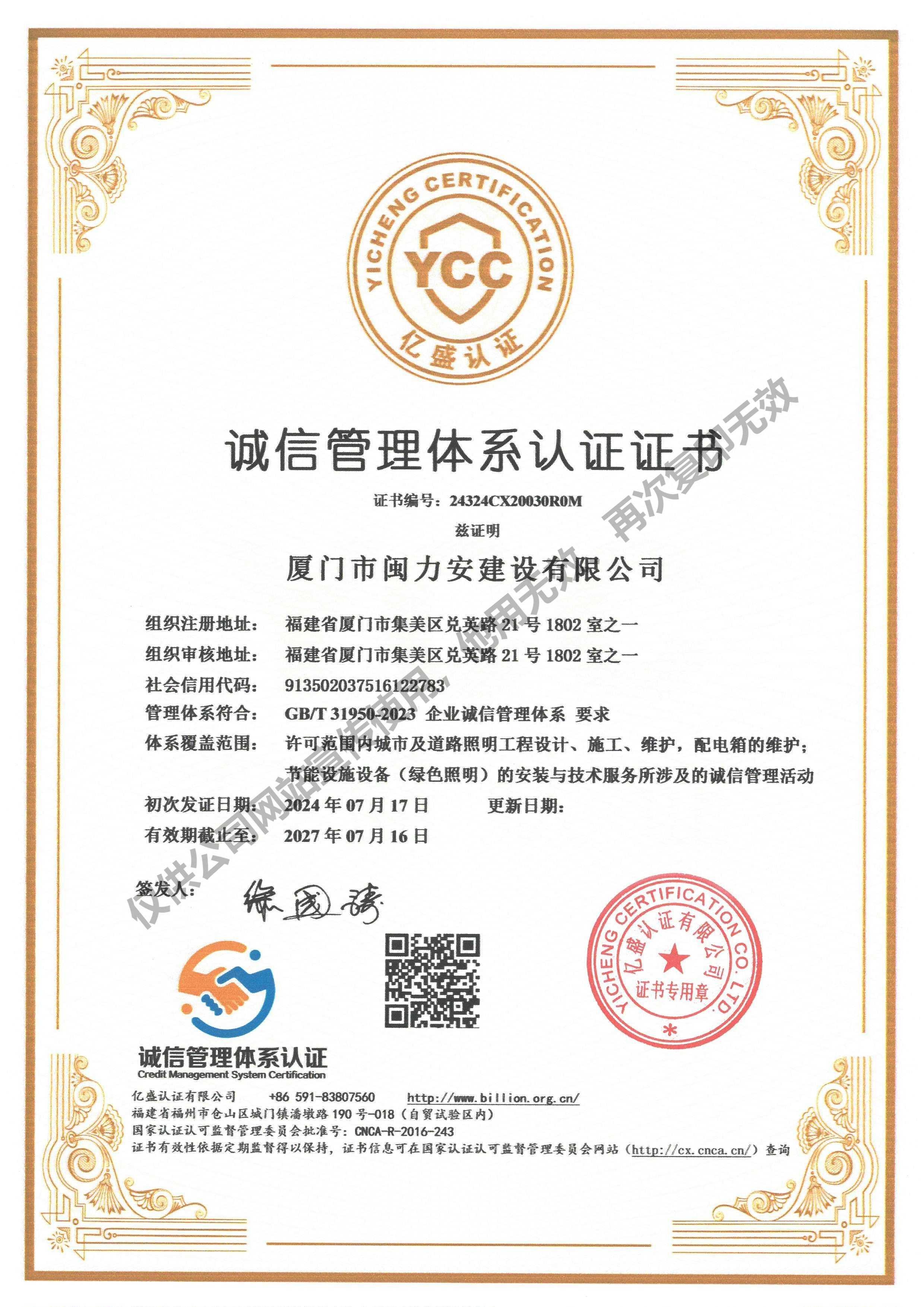 廈門市閩力安建設有限公司成立于2003年,公司取得市政公用工程施工總承包貳級、建筑裝修裝飾工程專業(yè)承包壹級、城市及道路照明工程專業(yè)承包壹級、電子與智能化工程專業(yè)承包貳級、消防設施工程專業(yè)承包貳級、電力工程施工總承包叁級、建筑機電安裝工程專業(yè)承包叁級、輸變電工程專業(yè)承包叁級、環(huán)保工程專業(yè)承包叁級、照明工程設計專項甲級、建筑裝飾工程設計乙級、施工勞務等資質的綜合型企業(yè),公司于2013年通過了ISO9001質量體系認證,ISO14001環(huán)境管理體系認證,OHSAS18001職業(yè)健康安全管理體系認證。